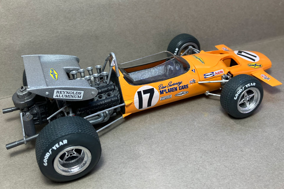 Designed for the Heller McLaren M7 kit with update parts from Kevin Kuzman. Markings for Dan Gurney (French GP - last points paying finish for Gurney), Denny Hulme German GP (3rd place) and Bruce McLaren Monaco - his last race. The update kit from Kevin Kuzman only covers the Gurney car - scratchbuilding/modifications may be necessary to do the other versions. Model photos courtesy Kevin Kuzman.