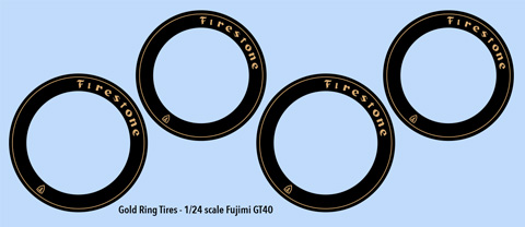 1/24 scale high profile tires fit 1/24 Fujimi GT 40 tires. These tires run narrow and tall. These tires have gold lettering.
