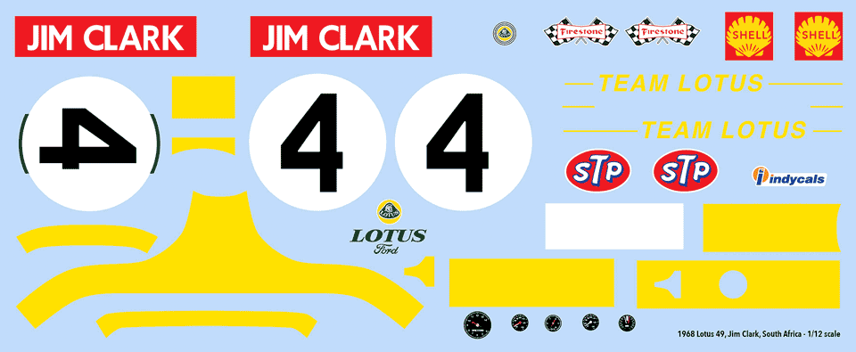 We have decals for all races of the 1967 season plus the 1968 South African Grand Prix (middle picture).These are available in 1/43, 1/32, 1/24, 1/20 and 1/12 scale. Sheet may vary from pictured depending on which race you have selected. Decals may vary from images above based on what race you ordered. South Africa has the most markings (top image - 1/12 scale sample) and Holland and other races have very minimal markings (second image 1/20 scale sample). Each variation will have approriate markings and name plates when applicable based on the race you select.