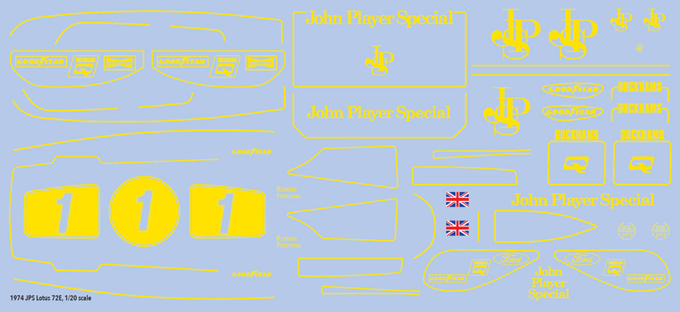 Designed to fit the 1/20 Ebbro Lotus 72. Note - these decals are printed in bright yellow - in 1974 the livery changed from metallic gold to a highly relfective bright yellow, before finally changing to 'biscuit' color in 1976.