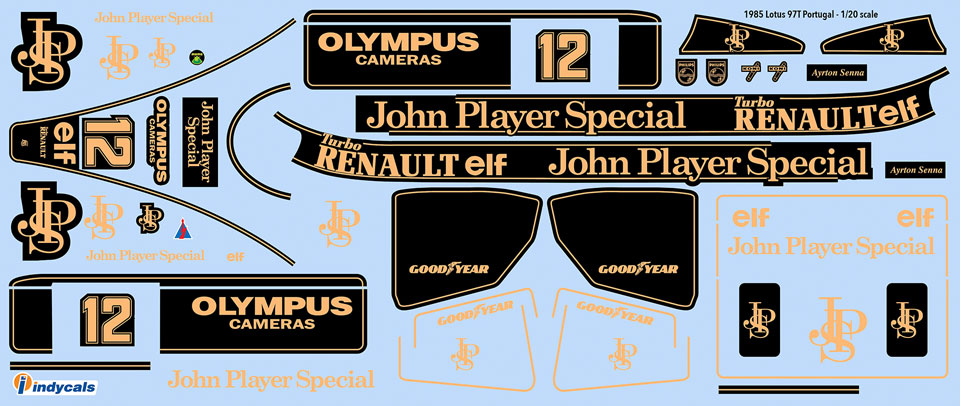 Designed for use with the Fujimi Lotus 97T Portuguese Grand Prix kit (pictured) commemorating Ayrton Senna's first win, or the Fujimi Lotus 97T Belgium Grand Prix (Senna's second win). Please specify which version you need when ordering as the decals for one kit, won't work for the other. Actual sheet may vary depending on version selected. 1/20 scale comes with pre-printed carbon fiber wing decals (last two images). Available in 1/20 and 1/32 scale. Note - 1/32 scale has not been tested on any 1/32 bodies, fit issues may results - it is 'buy at your own risk'.