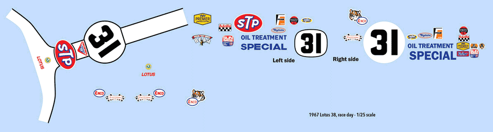 Designed for Lance Sellers 1/25 scale Lotus 38 kit, available in a variety of scales. Available in qualifying (top photo) or race day trim (bottom photo and actual car photos)