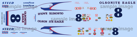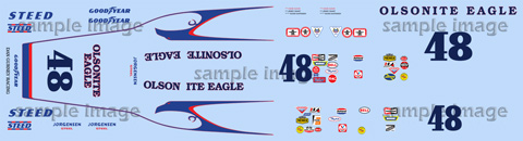 Designed for the 1972 Eagle full resin kit by Kevin Kuzman. Markings for the 1973 Olsonite Eagle driven by Bobby Unser (#8) and Jerry Grant (#48). Availalbe in a variety of scales.