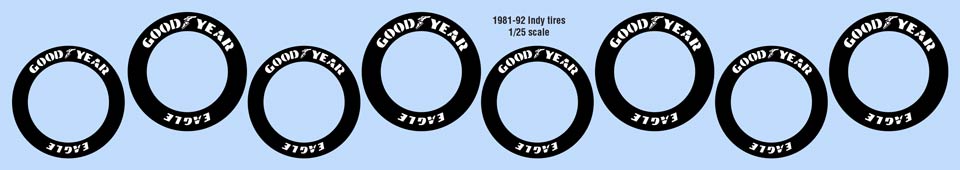 "Eagle" Tire decals for 1981 through early 1992 Indy cars. Each scale has one set of tire decals per sheet. (one set equals enough to do both sides of four tires). The black sidewall produces a cleaner finished result than clear decal film which is very noticeable on a finished tire. We recommend trimming these right to the black areas when applying them. Please note, these markings may not fit over raised lettering on tires. Do NOT order these for F1 cars - the markings are not the same. F1 tires have a separate section.